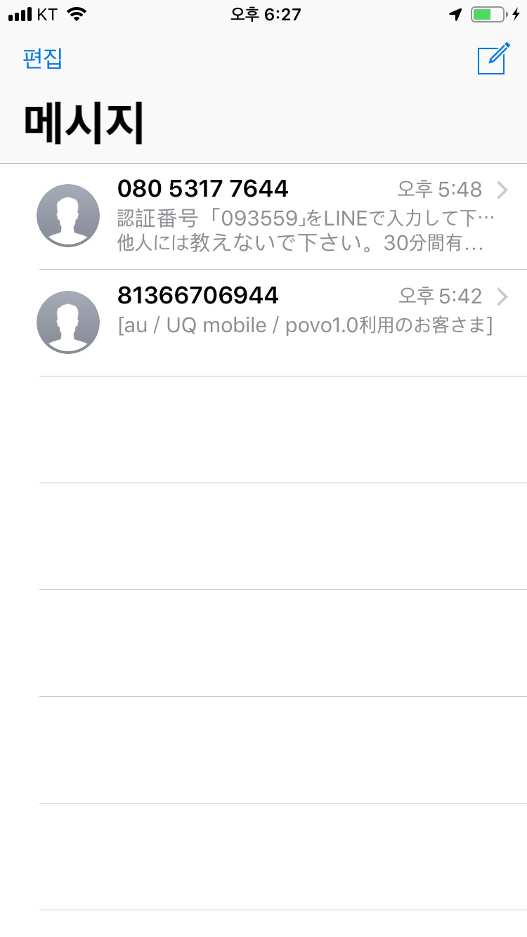 굴러다니는 아이폰 하나에 끼우고 설정해봤습니다. KT로 잡히고 일본 외무성에서 해외 안전 문자가 온 모습입니다.