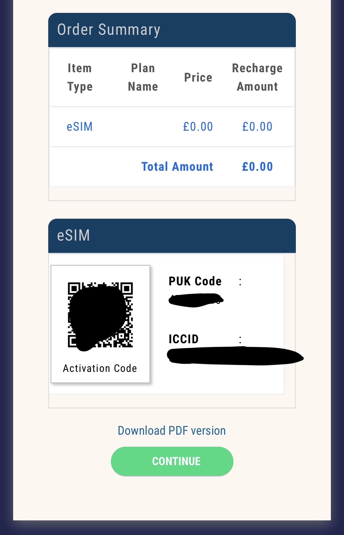 아래로 스크롤을 내리면 주문 내용과 eSIM QR코드, PUK, ICCID를 알려줍니다. 아까 입력한 이메일로도 한번 더 보내줍니다.