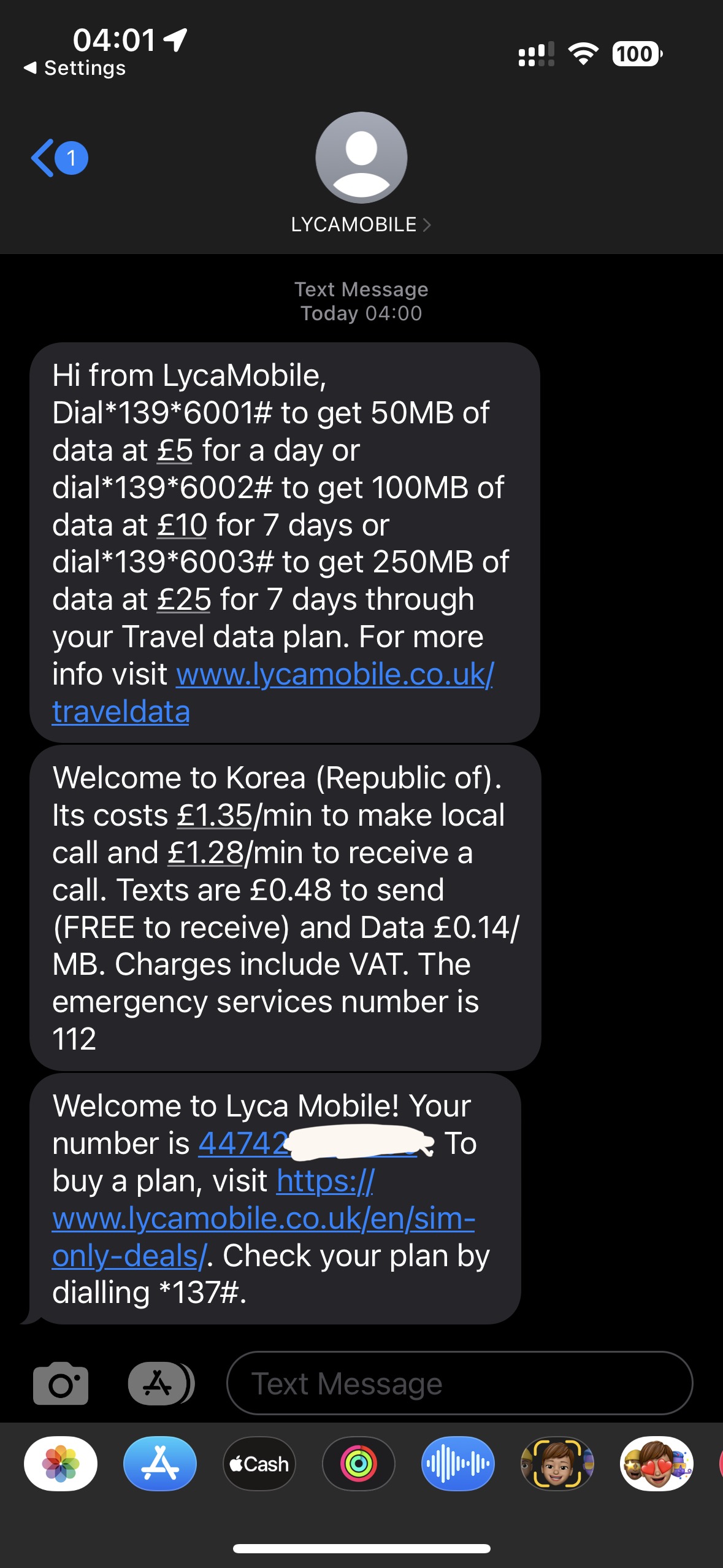 자동으로 로밍이 잡힐텐데, 망이 제대로 잡히면 문자가 도착합니다. 마지막 문자에서 ‘Your number is ~’부분에 447로 시작하는 번호를 알려줍니다. 그 번호 앞에 +를 붙인 것이 본인 번호라고 생각하시면 됩니다. 영국 현지에서는 번호 앞에 +44 대신 0을 붙입니다.