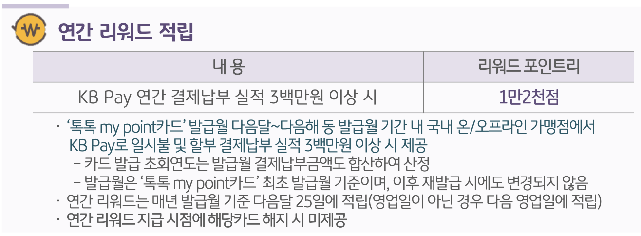 이 카드로 연간 3백만원 이상 KB Pay 결제 시 포인트 12000점을 리워드로 제공합니다. 월 평균 5만원 추가 이용으로 월 평균 1000점을 더 가져갈 수 있습니다.