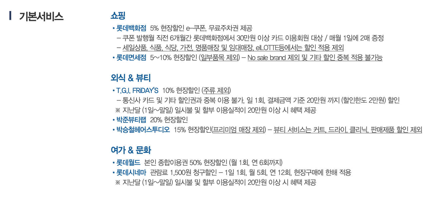 그 외에 자잘한 혜택으로는 롯데면세점 현장할인, 롯데월드 종합이용권 할인 등이 있네요..