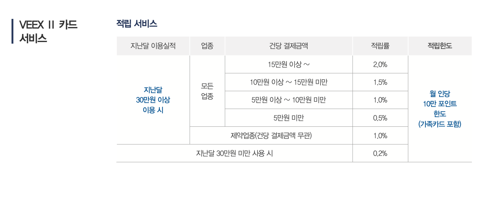 기본 혜택입니다. 적립한도가 생긴 것을 제외하면 VEEX 카드와 똑같습니다. 월 10만포인트 한도이니 2% 기준 500만원까지입니다. 그리고 보시면 아시겠지만 이 카드는 건당 15만원 이상 결제하는 것이 핵심입니다.
